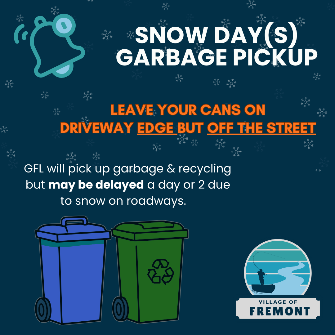 Please leave your cans on your driveway edge but off the street until they pick up. GFL will pick up garbage and recycling, but may be delayed a day or two. We appreciate your patience with the plowing and pickup services.